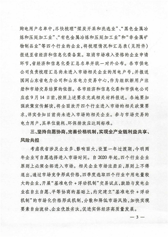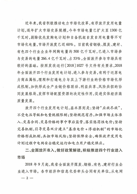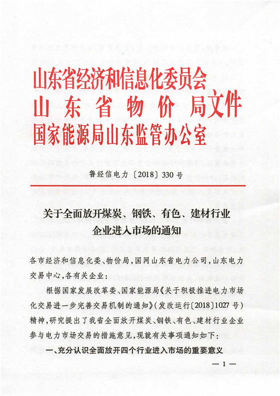 2018年 9月山東經(jīng)信委、物價局、能源局聯(lián)合發(fā)文《關于全面放開煤炭、冶金、有色、建材行業(yè)企業(yè)全面進入市場的通知》(魯經(jīng)信電力【2018】330 號文);強制要求煤炭、鋼鐵、有色、建材四大行業(yè),2019年底必須納入市場化交易,否則將執(zhí)行懲罰電價。